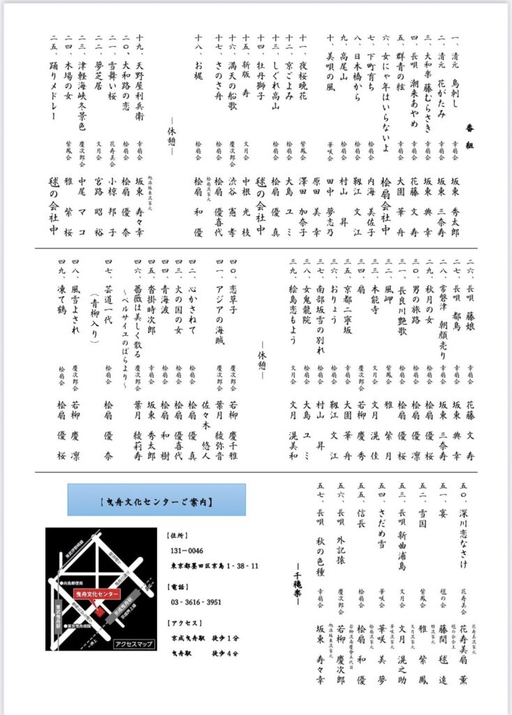 【出演】10月13日 幸扇会 投稿日 2025年10月9日 著者 wakayanagi カテゴリー 公演案内 令和七年十月十三日(祝・月) 曳舟文化センター(東京都墨田区京島一丁目38番11号) 入場無料 開場 午前十時 開演 午前十時三十分 主催 坂東寿々幸 【慶次郎会出演者】 十六、 満天の船歌 渋谷憲孝 二三、 津軽海峡冬景色 中尾マコ 三四、 扇 若柳慶秀 四〇、 恋草子 若柳慶千雅 四一、 アジアの海賊 葉月綾弥音 佐々木悠人 四六、薔薇は美しく散る〜ベルサイユのばらより〜 葉月綾莉寿 四八、 風雪よされ 若柳慶凛 五六、 長唄外記猿 若柳慶次郎